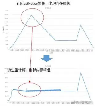重计算 (Rematerialization) 针对正向算子的输出累计保存在内存中,导致内存峰值过大的问题,舍弃了部分正向算子的输出,而是在反向阶段用到时再重新计算一遍。这样做有效地降低了训练过程中的内存使用峰值。如下图所示,第一个内存峰值通过重计算消除,第二个内存峰值可以通过前面讲到的优化器并行消除。