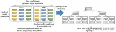 下图 (b) 是一典型的树形的硬件拓扑结构,其带宽随着树深度的增加而降低,并且会产生一些流量冲突。为了利用此特征,MindSpore 的目标是最大化计算通信比,将通信量大的并行方式(算子级并行)放置在服务器内部的多卡之间;将通信量较小(Pipeline 并行)的放置在同一机架内的服务器间;将数据并行(优化器并行)的部分放置在不同机架间,因为该通信可以和计算同时执行(overlap),对带宽要求较低。