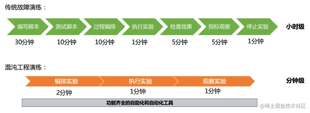 从腾讯互娱的统计数据来看,通过混沌工程与传统的故障演练进行对比,混沌工程的效率至少提升了 10 倍以上,这就是做混沌工程最大的收益。