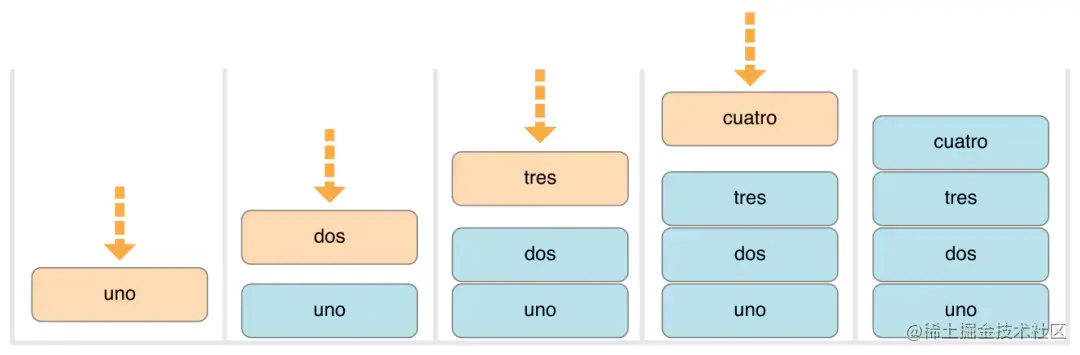 这是往栈里压入四个值之后, stackOfStrings 的图示: