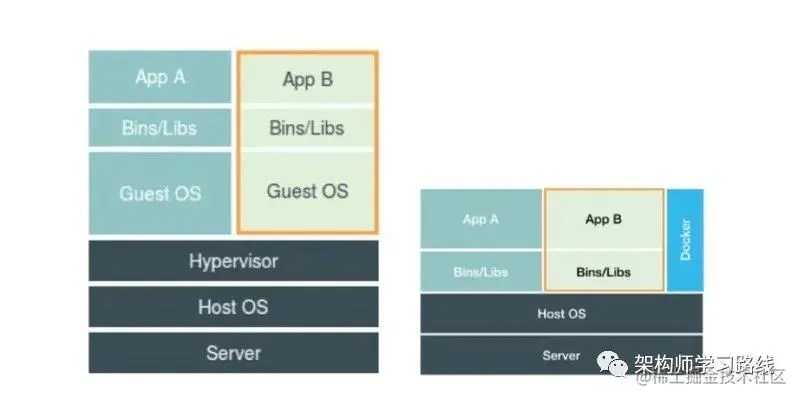 说到这里,不得不说下容器与传统意义的虚拟机间的对比。其实二者都可以理解为虚拟化,它们最本质的区别是,容器是操作系统层级的虚拟化,而虚拟机是硬件层级的虚拟化。参看下图。