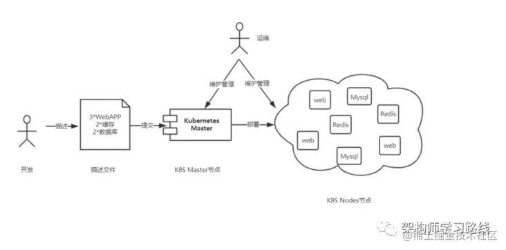 - K8S集群由一个主节点(master节点)及多个工作节点(node节点)构成,开发者提交应用容器镜像,并将镜像运行的数量、方法等通过描述文件提交给K8S master节点,K8S master节点或根据集群整体情况,将应用按照需求部署在工作节点中。对于开发者来说,利用K8S可以方便的部署程序,不用关心基础设施,而对于运维人员来说,工作重心从维护具体应用,转变为维护K8S集群。而且,不管是开发者还是运维人员,都不用关心应用具体部署在哪个节点,K8S会自动判断搞定一切。相比于传统的应用部署方式,有没有觉得K8S很棒棒?