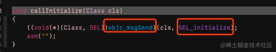 callInitialize()的实现,也证实了,系统确实是通过消息机制objc_msgSend()来调用+initialize方法的。好了,源代码分析结束。