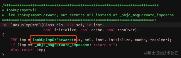objc-runtime-new.mm文件下(很明显objc-runtime-old.mm应该是过时的源码)看到该函数的实现里面,有一个lookUpImpOrNil函数,这个便是具体的方法查找函数,继续进入其中