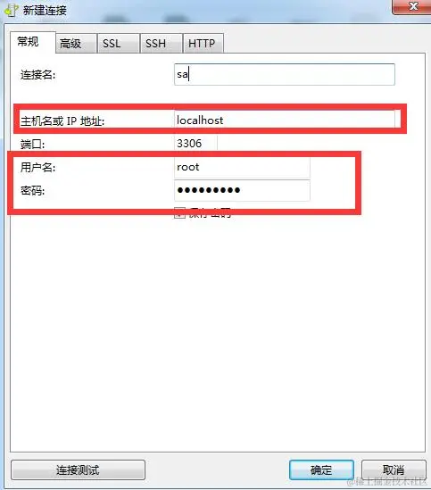填写的信息如图所示,localhost是本机的ip地址,用户名和密码是建Mysql时的用户名和密码。