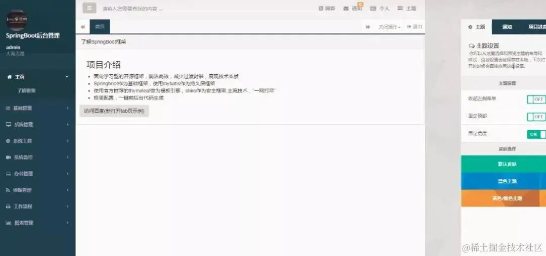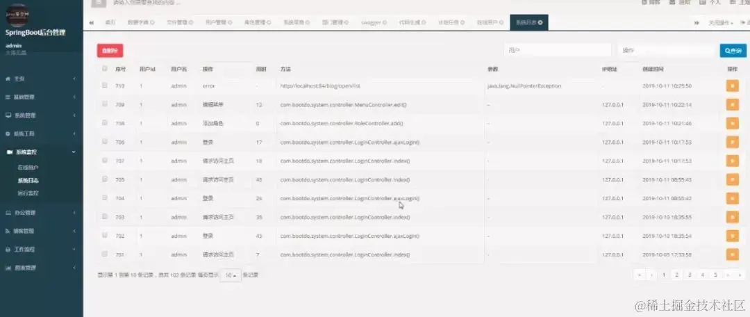 用到的技术都是主流的。本系统是在SpringBoot基础上搭建的一个Java基础开发平台,MyBatis为数据访问层,ApacheShiro为权限授权层,Ehcahe或Redis对常用数据进行缓存。包括系统管理、内容管理(CMS)、在线办公(OA)、代码生成模块、数据监控、日志管理、图标管理等。系统提供了常用工具进行封装,包括日志工具、缓存工具、服务器端验证、数据字典、当前组织机构数据(用户、机构、区域)以及其它常用小工具等。另外还提供一个强大的在线代码生成工具。
