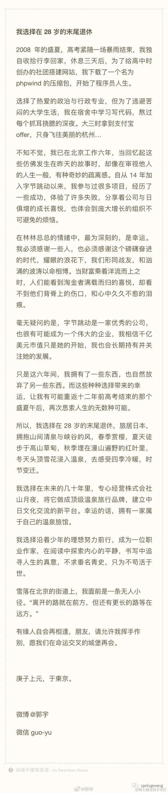 今年二月,郭宇在微博发文:“我选择在 28 岁的末尾退休,拥抱山间清泉与峡谷的风,去感受春秋冬夏。有缘人自会再相逢,朋友,愿我们在更广阔的世界再会!“”