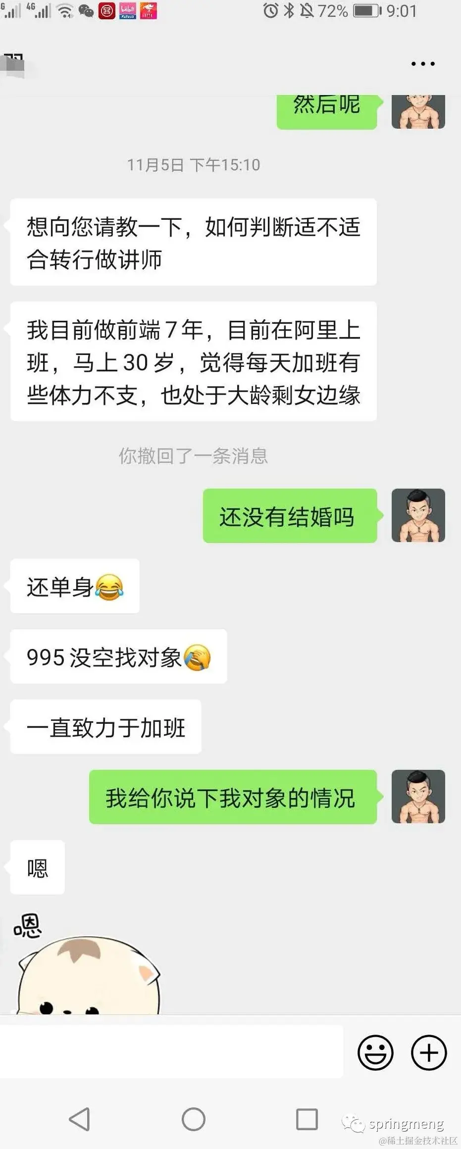小姐姐在阿里P6,感觉升P7无望,到了结婚的年龄,也不能一直过996的生活,有想当培训师的准备,问我程序员转讲师到底好不好。