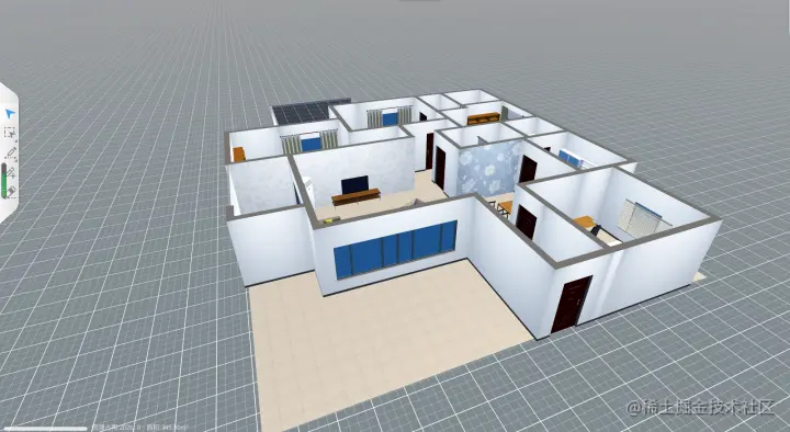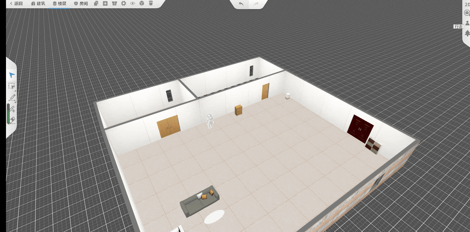 场景创建完成后,在场景预览中,点击右上角的行走图标,将红色光标放置在闭合墙体构成的地面上,或自定义建筑的室内,即可从第一人称视角预览场景。