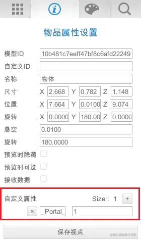 在自定义属性中添加传送属性_Portal_,参数配置为要传送物体的自定义ID,预览时候走到物体上就会传送到指定ID的位置。Portal两边必须添加下划线(即_Portal_)。否则,配置不能生效。