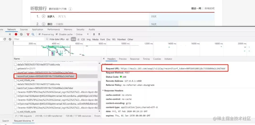 现在考虑一下怎么构造这个请求,首先是csrf_token这个东西从哪来,之前的文章其实说过,在用户登录后的cookies里可以直接找到该参数,如下图红框所示(当然如果在非登录状态下也能看到目标用户的听歌排行榜,那么这个csrf_token其实是可有可无的):