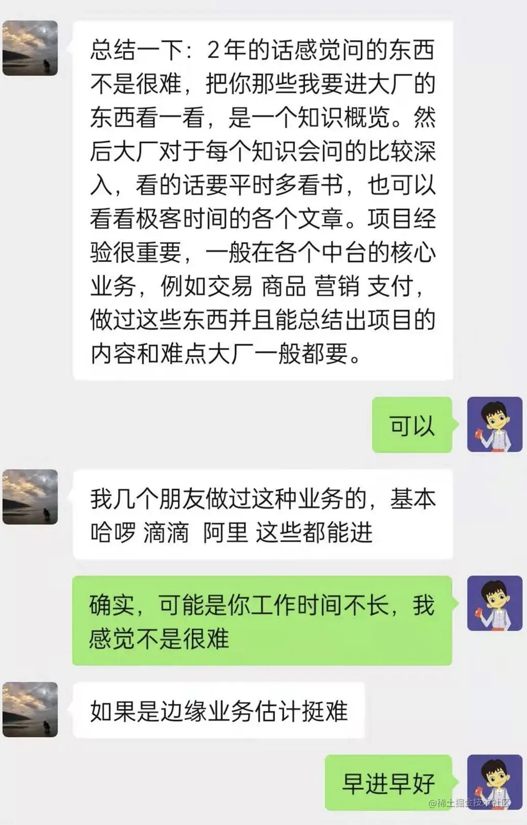 2年的话感觉问的东西不是很难,把你那些我要进大厂的东西看一看,是一个知识概览。然后大厂对于每个知识会问的比较深入,看的话要平时多看书,也可以看看极客时间的各个文章。