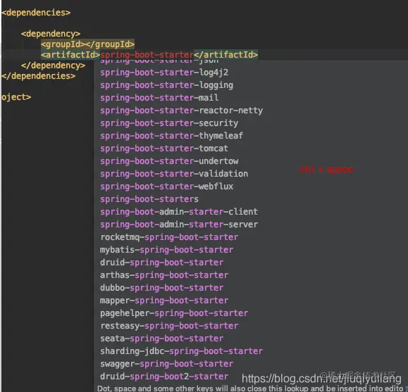 所有官方的starter都遵循spring-boot-starter-的命名方式,其中是指特定类型的应用。这样的命名方式可以帮助我们非常方便的查找starter。在POM编辑器中按ctrl-space 并输入spring-boot-starter可以获得完整的starter列表,一目了然。