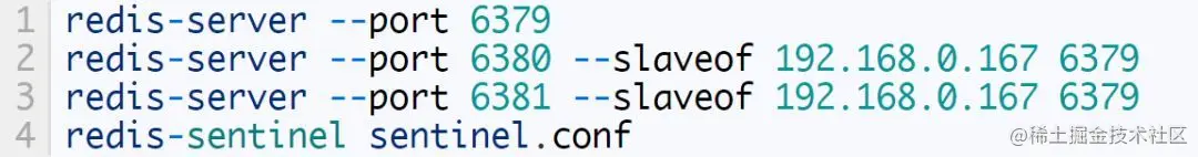 其中mymaster表示要监控的主数据库的名字。配置哨兵监控一个系统时,只需要配置其监控主数据库即可,哨兵会自动发现所有复制该主数据库的从数据库。