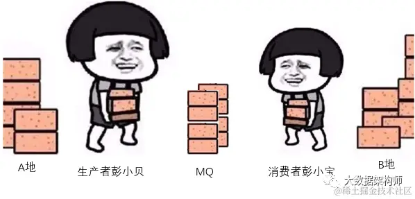 在彭小贝和彭小宝之间增设一个消息中间件,生产者彭小贝把砖头放在MQ里,彭小宝从MQ中拉取砖头,堆放到B地。任何一方短暂罢工或者爆发都不影响整个链条的砖头搬运工作,完美!