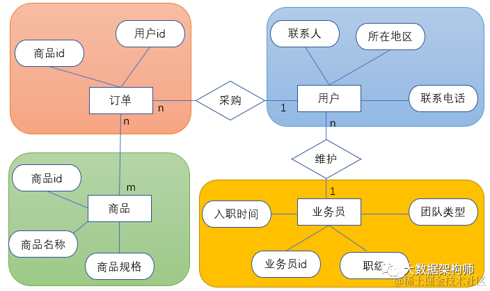 业务员维护用户,一个业务员可以维护多个用户,他俩之间的关系就是一对多;用户采购商品,一个用户可以采购多个订单,关系是一对多;一个订单可以下多个商品,一个商品可以被多个订单采购,所以他俩的关系是多对多。\
