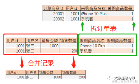 上图中,原表的用户id重复出现2次了,原因有2:销售额和销售量出现错行,需要合并;采购两个商品,这两个商品与主键“用户id”不是一一对应的,所以需要拆出一个订单商品表。