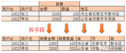 上图中,销售下有金额和数量,咱数据库可不能做成多表头的样子,所以只能把表头拆分。地区中含有省市县三级,不是最细的原子粒度,所以也需要拆分。