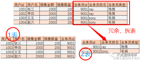 上图中的例子,业务员姓名和类型信息在用户销售表中被冗余了,不符合第三范式,所以需要拆表。1表的用户id是主键,业务员id是外键与2表的业务员id主键关联。
