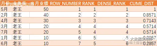,CUME_DIST() over (partition by 业务员 order by 当月业绩) as CUME_DIST1