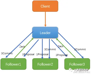 - Leader把客户端的事务请求转化为一个事务Proposal即提案/提议,并将Proposal提案发给集群里所有的Follower节点服务器。
