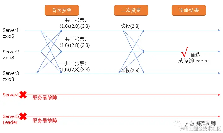 - 二次投票:每个节点收到所有节点的MyID和ZXID后,先比对ZXID,选取最大的那个,如果ZXID一样,则选取MyID最大的,重新投票。