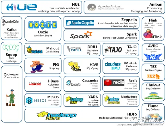 Hadoop是只大象,hive是大象+蜜蜂,Flink是是松鼠,Chukwa是只乌龟,pig是只猪,TEZ是个大象脑袋,TAJO是一只鸵鸟。整个Hadoop体系就像是一个动物园一样,管理着整个动物园。