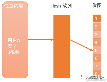 上图中,用户A看了视频B,hash后的值是5,那么第5位的值就变成1了。如果我们想判断用户A是否看了视频B,只要看看第5位是不是1就可以了。