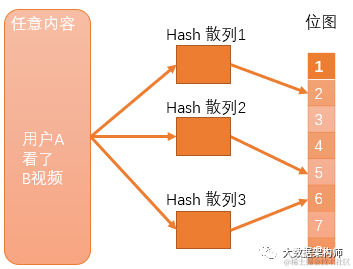 用户A看视频B,3次hash散列结果是2、5、6;