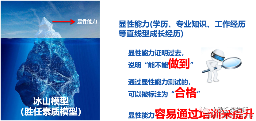 通过显性能力测试的同学,说明能够完成当前的工作,可以被标注为合格候选人。但是很明显,我们总是希望选拔进来的同学能够有充足的发展,给企业创造更多的价值。这时候就得看冰山之下的能力-隐形能力了。