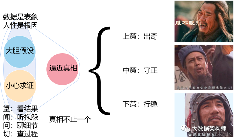 至于你选哪一个,看你想当凤雏、卧龙还是冢虎了。但是不管是哪一个,你都将无敌于天下,因为你能看透他的需求,洞悉他的问题,理清业务流程,清晰他的业务目标,知晓他的执行过程,辨别他的是非真假,站在一个比他更高的维度,观察他,理解他,透视他,然后再剖析问题,发现异常,拨开迷雾,逼近真相。