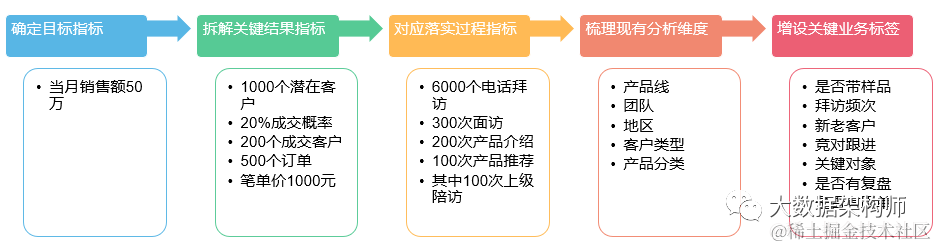向下梳理,把核心目标拆解为核心关键结果指标,然后再映射到过程指标,梳理分析维度,细化到每个业务细节,并增设标签,吃透了,这就进入到“入微”境界。