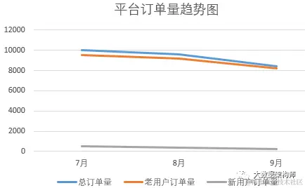 我们把总订单量、老用户订单量、新用户订单量做一个趋势图,很明显能看出,新用户本来订单量就少,就算全部没了,对大局影响也不大。而造成平台总订单量下降的主要原因是老用户订单量的下滑。