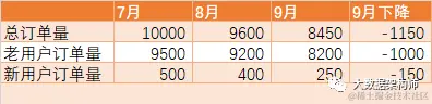 从下降的绝对值上看,9月总订单量下降1150单,老用户占了1000单,新用户只下降了150单。所以总订单量下滑跟新用户压根就没啥大的关系。而且,下降趋势从8月就已经开始了。