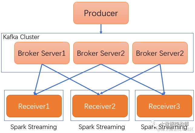 这种语义其实就是使用Receiver直接接收Kafka的数据。Receiver接收数据后,存储在Spark的执行器中,Spark Streaming启动的作业会去处理数据。