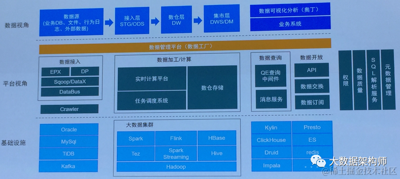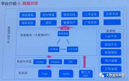 最后是数据开放。贝壳的几位同事都共同提到一句话:数据的价值再大,不对外开放,那就是垃圾,我表示非常认同。数据放在那里就是成本,开放、共享出去才有价值。后面的OLAP平台、DMP平台、推荐平台、算法中台都是从大数据平台这边获取的数据,贝壳的app也大量从大数据平台这边获取各种数据。