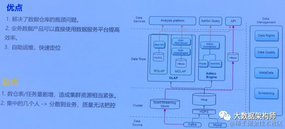 对比上一版,这边对数据处理这边做了很多改进,建了数仓和即时查询引擎,加了数据产品对外提供自助式查询和分析的服务。不过这ROLAP没太看明白,直接用MySQL+Rest API?这效率没法看了吧?