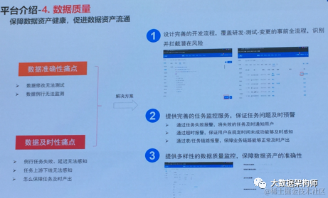 这边的数据质量基本上也是通过完善开发流程、完善任务监控体系和事后的数据质量监控来完成的。这部分略显薄弱,缺少数据质量分析、评估、验证和数据质量问题管理。我估摸着这边还是以先满足业务需求为准吧,反正数据错了有人会找上门来的。