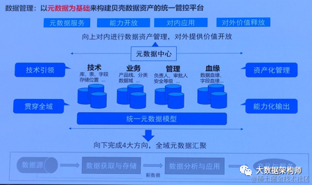 这个架构看起来是不是就有数据中台的意思了?值得注意的是,贝壳也开始尝试TiDB了,这应该也是大趋势。数据接入方面,开始用阿里的dataX、DataBus等产品,可视化那边自建了一个奥丁,数据开放也增加了数据交换和数据订阅,管理层面增加了元数据管理、数据质量和数据权限。基本上数据中台的基础层面就已经比较完善了。所以在这一版中,大量的增加了可视化编程工具,简化开发流程;增加了大量的管理工具和自动化运维工具,进行了数据标准化和质量管控,对外开放了大量的数据,实现了数据资产盘活。