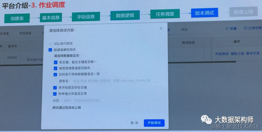 贝壳的哥们是真猛,把内部系统都截图出来了(ppt里有更多截图,在这里我就不放那么多了)数据产品经理可以抄一下作业哈(抄其他数据中台产品的作业更完整)。作业调度这边,为了保证任务的健壮性,这边设置了几道防线:sql执行测试、数据准确性测试和最终的上线。