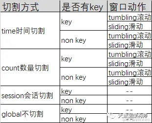 总结一下,Flink的窗口按切割方式、是否有key值、滑动还是滚动三个维度,分为以下几种情况: