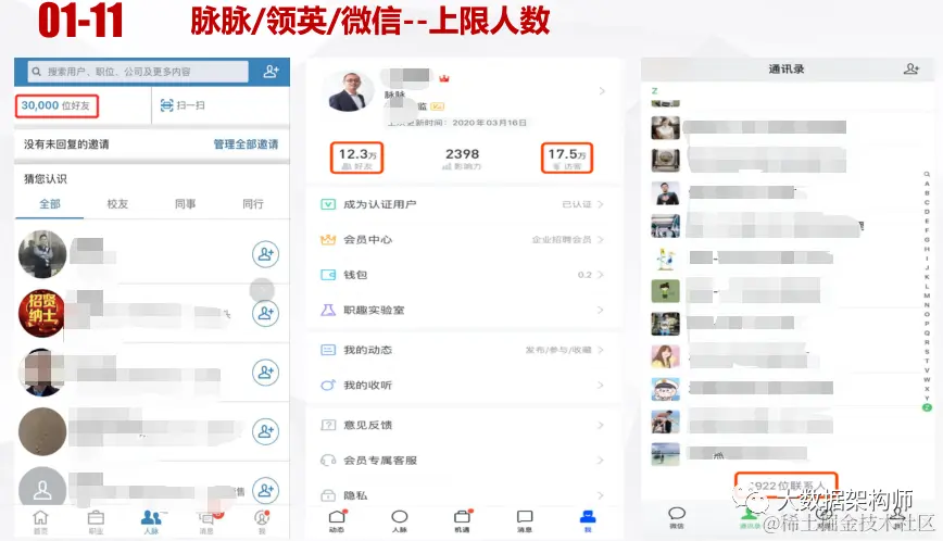 领英个人最多30000好友,微博2000关注,脉脉无上限,微信5005好友(一说可以超过,但无法看朋友圈,奇怪的知识又增加了)。