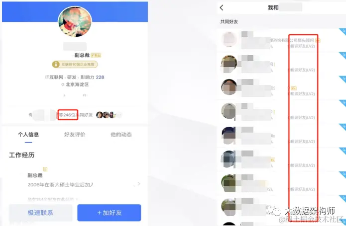 然后,我们以终为始,逆向寻找能够提供电话的人。春明举了一个例子,比如他要找某副总裁,自己没有与他发生任何联系,但是在脉脉上有246位共同好友,随便找一个与他相识度为2、3的好友诚恳沟通一下,就能间接拿到联系方式了。