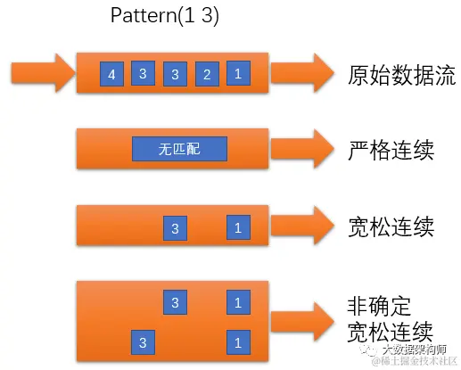为了应对流数据的扰动,Flink的CEP还设置了严格连续、宽松连续和非确定宽松连续三种匹配方式。