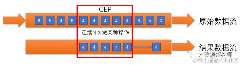 如上图所示,原始数据流中源源不断的走过非常多的数据,我们定义一个CEP,假设是某个IP地址连续抢5个红包。一旦数据流中出现这种情况,Flink会迅速锁定,交给后续处理。