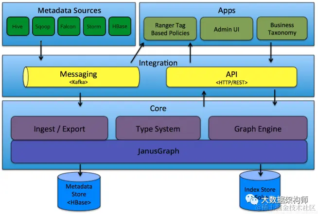 - 图形引擎(Graph Engine:): Atlas用图数据库保存和管理所有元数据,所以下面才会有JanusGraph存储元数据对象。