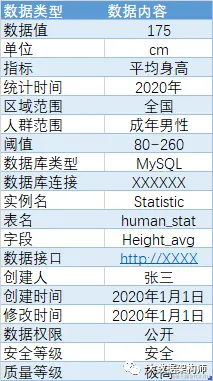这样是不是就很清楚了?175的意思是:2020年统计的全国成年男性平均身高,该值的合理阈值是80-260cm,数据目前存在MySQL中,访问连接是XXXX,由国家统计局的张三在2020年1月1日创建,数据目前是公开的,很安全,质量经过多重确认无误的。