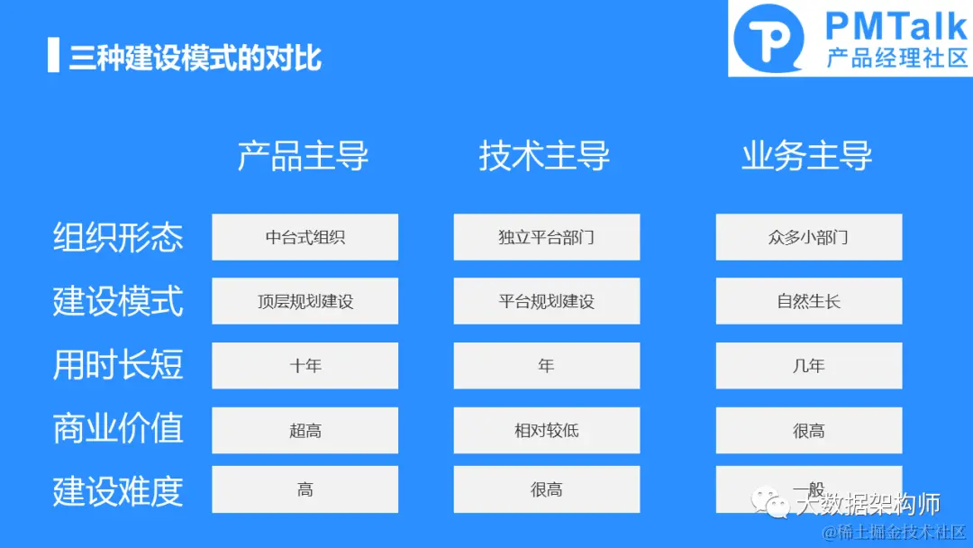 人月神话中有提到一个“康威定律”,用人话说也就是说组织形态决定了产品形态。产品主导就是上帝视角进行建设,技术主导是在业务逻辑基础上,因势导利,建设平台,业务主导最野蛮,河流往哪走,地形就得跟着变。