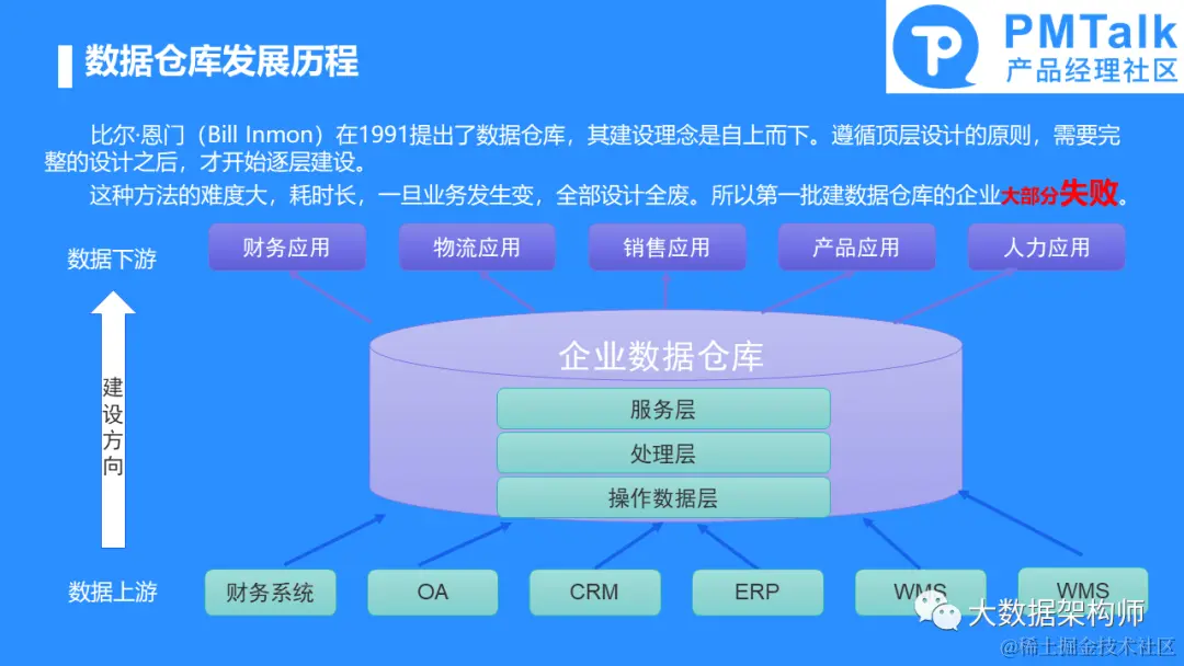 其实数据中台和数据仓库非常像的。Inmon最早提出了数仓的概念,并且提出了完整的建设方案。方案是从数据上游向数据下游的方向全面建设,这很像产品主导的模式。但是这种模式遭遇到了前所未有的大败局:几乎所有的数仓项目都失败了。