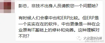 其实老赵的问题很有意思,拿ERP和中台对比。这么对比,肯定不是数据行业的同学,也不会是互联网公司的同学,更像是一个传统企业信息化负责人。
